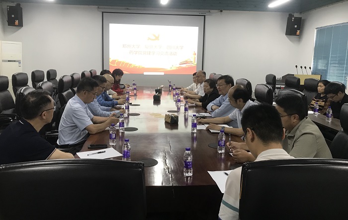 2023年6月5日,竞技宝 与四川大学华西竞技宝 、郑州大学竞技宝 在郑州黄河迎宾馆开展了党建交流活动。竞技宝 党委书记王建新教授、副院长戚建平教授、教工四支部书记黄容琴教授及教工四支部党员代表,四川大学华西竞技宝 党委委员高会乐教授及药剂系党支部党员代表,郑州大学竞技宝 党委书记袁风兰、执行院长张振中教授、党委副书记苗卿、办公室主任邵彦江、药剂系党支部书记刘伟教授、药物分析系党支部书记王蕾教授及党员代表参加了本次交流活动。