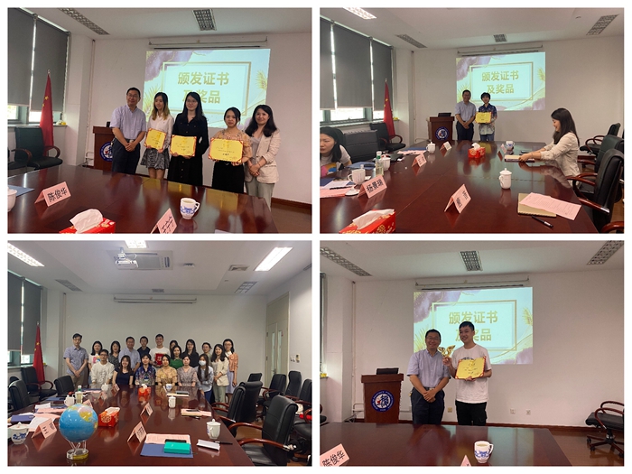 随后,竞技宝 党委副书记王宁宁老师宣布决赛结果。2020级硕士生李豪彬和2018级本科生汤栩懿分列一、二等奖,三等奖获得者为2020级硕士生张露予、万米阳和2019级硕士生刘艺朴。杨景瑞校友为获奖同学颁发了证书和奖品并合影留念。至此,第三季毕凯英才PPT大赛决赛活动圆满结束。