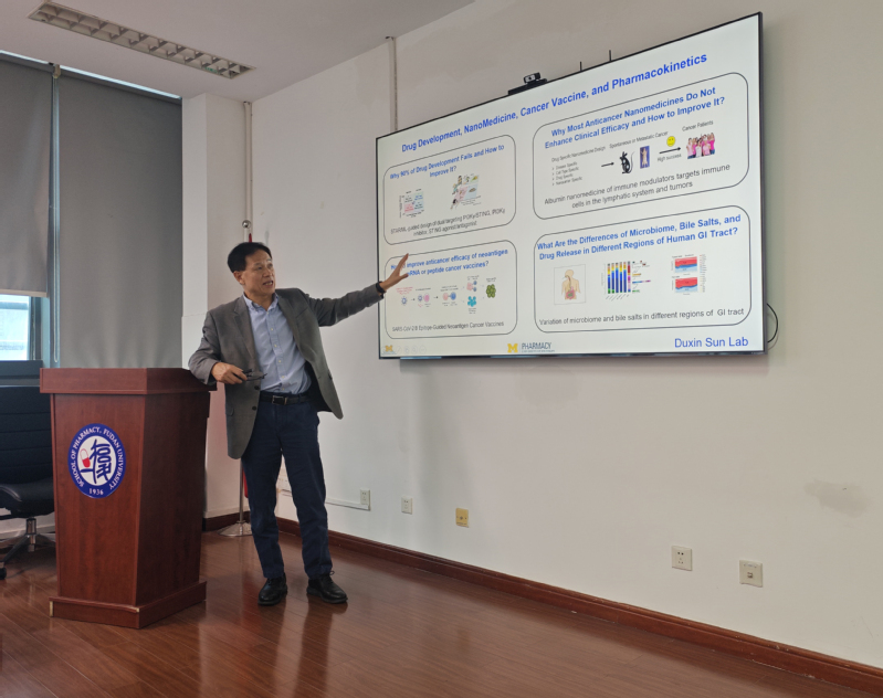 孙笃新教授在报告中剖析了胰腺癌现有治疗方案的瓶颈问题,介绍了他将STING激动剂和PI3Kγ抑制剂偶联、借助免疫细胞调节(特别是Breg细胞)提升胰腺癌治疗效果的最新思路, 展示了以白蛋白载体技术递送该偶联物的出色疗效。在随后的交流环节中,孙教授与在座的30余位师生进行了充分沟通,鼓励青年教师和研究生提高站位,勇于创新、敢于坚持、乐于深入,多做新颖性和应用性兼备的科研工作,争取做高端制剂领域的领军人才。与会师生受益匪浅。