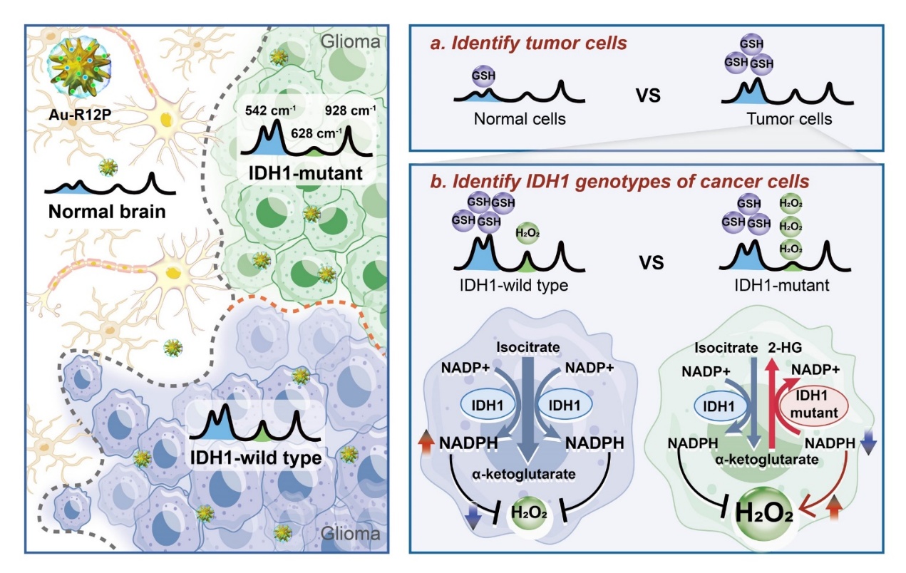 胶质瘤作为最常见恶性脑部原位脑瘤,手术切除是首选治疗手段。由于胶质瘤细胞脑内侵袭的复杂性和异质性,精准界定肿瘤边界面临诸多挑战。不完全除造成恶性组织残留导致肿瘤快速复发,而过度切除则可能造成脑神经功能损伤。2021年世界卫生组织(WHO)第五版中枢神经系统肿瘤分类指南将分子特征作为胶质瘤分类标准,其中异柠檬酸脱氢酶1(isocitrate dehydrogenase 1, IDH1)基因成为分子分型的核心指标。IDH1是三羧酸循环关键限速酶,其突变型(R132H等)会产生致癌代谢物D-2-羟基戊二酸(D-2HG),其干扰DNA和组蛋白去甲基化过程,导致细胞表观遗传程序紊乱,促进肿瘤细胞去分化与增殖。IDH1快速分型对提高手术预后具有重要临床意义。IDH1野生型肿瘤通常对术后放化疗响应不佳,临床推荐尽可能完全甚至扩大切除;而IDH突变型则对放化疗响应较好,建议在保留神经功能前提下精准切除。因此,术中IDH1快速分型对优化胶质瘤手术策略,提高手术预后具有重要意义。