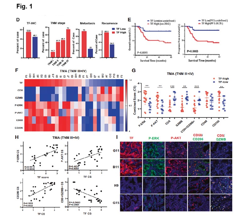 肿瘤微环境中富含肿瘤相关巨噬细胞(TAMs)。大多数TAMs是促进肿瘤生长的M2型巨噬细胞,而抑制肿瘤生长的M1型巨噬细胞则是少数。CSF1是主要由肿瘤产生的因子,负责M2型巨噬细胞的招募。在HuSC1-39或MTI-31处理的肿瘤中,虽然总的巨噬细胞(F4/80+)水平并没有受到很大影响,但M2型巨噬细胞(F4/80+CD206+)和CSF1的数量显著减少,激活的M1型巨噬细胞(F4/80+/CD86+)增加。在TF敲除的肿瘤中也观察到这种促进M1型巨噬细胞的机制。