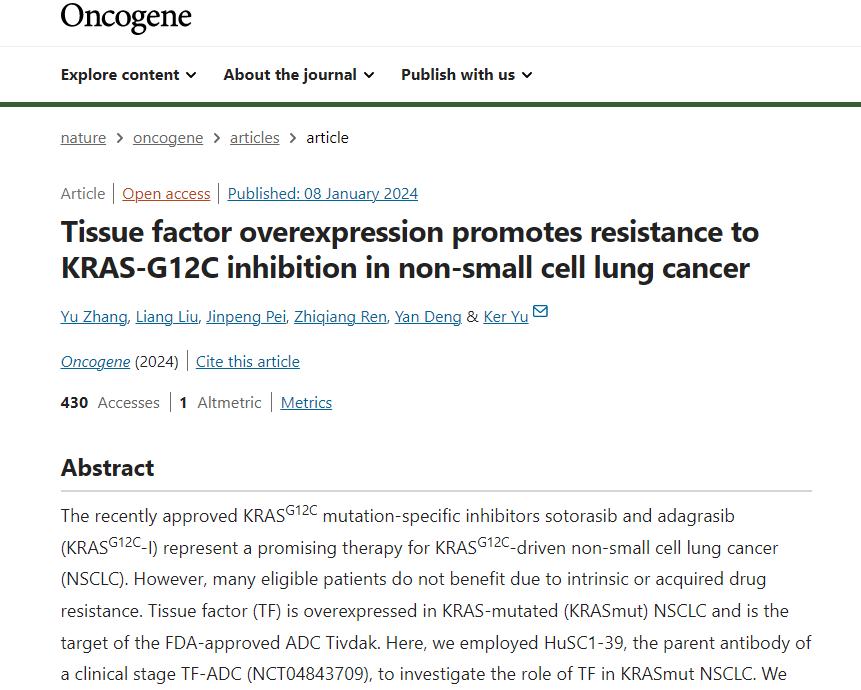 KRAS是最常见的致癌驱动基因之一,大约25%的非小细胞肺癌(NSCLC)患者携带突变的KRAS基因(KRASmut),其中KRAS-G12C是肺腺癌(LUAD)中最广泛的突变亚型。组织因子(Tissue factor, TF)在肿瘤的激活可以极大地促进癌症的恶性行为,且在肿瘤微环境(TME)影响治疗结果中扮演着越来越重要的角色。