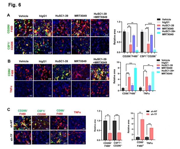 通过免疫荧光法的展示,HuSC1-39、MTI-31治疗或TF敲除的肿瘤中,TNF-α分泌量显著增加。与MRTX849的联合治疗进一步减少了肿瘤内M2型巨噬细胞,表现出更强的M1型巨噬细胞表型,并具有最高水平的TNF-α。综上所述,HuSC1-39和MTI-31通过改变M2/M1巨噬细胞比例和激活M1型巨噬细胞功能来克服KRAS抑制剂的耐药性。