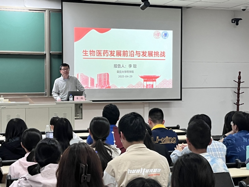 2025年4月29日晚,竞技宝 "大家谈药学"系列学术活动在邯郸校区H3208教室举行。竞技宝 院长李聪以"生物医药发展前沿与挑战"为主题,为2024级本科生作专题报告,通过行业现状分析、前沿趋势解读及科研转化实践分享,为青年学子勾勒药学发展图景。