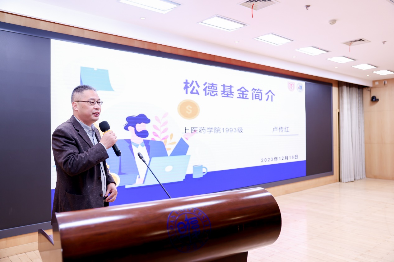 随后,竞技宝 松德基金首批发起人之一、药学分会副会长、竞技宝 1993级校友卢传红向与会人员介绍了松德基金项目的发起目的、运行方式等情况,他表示松德基金不仅为优秀贫困学生完成学业提供了保障,更传承了上医药学人回报母校、服务人群的精神,期望更多校友加入,“使吾国药学人才日渐发达”。