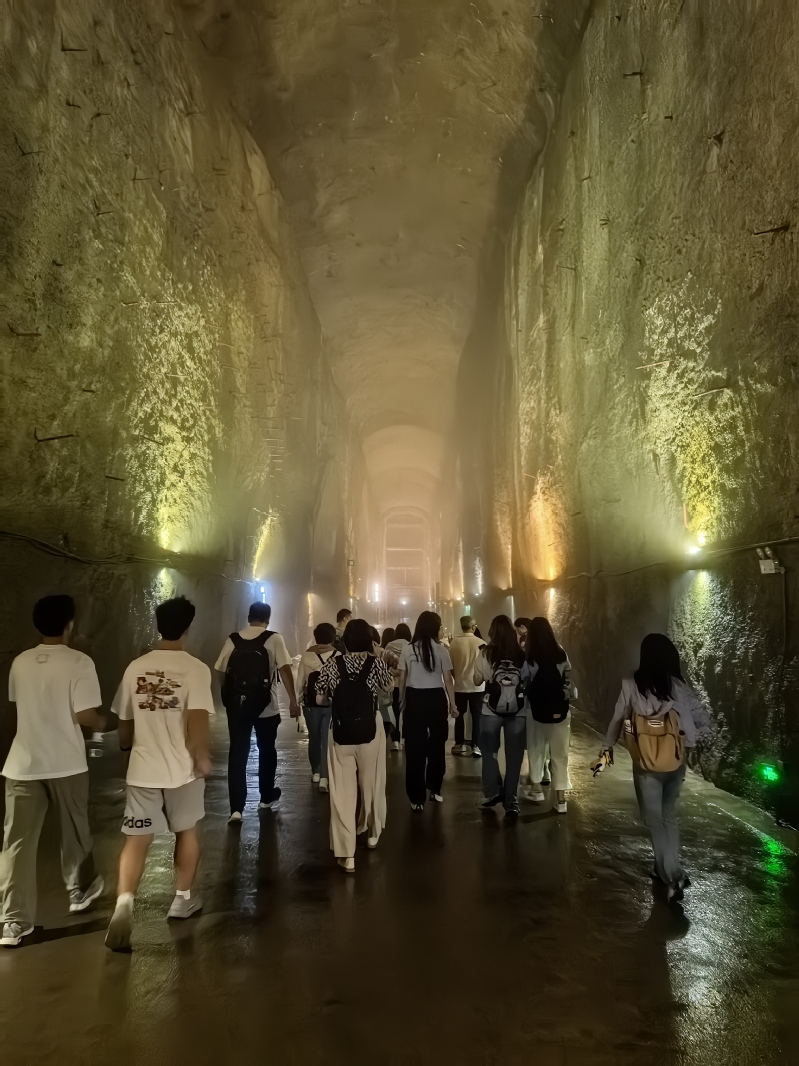 7月11日,实践团深入涪陵武陵山腹地,实地考察国家工业遗产816核工程遗址。这座世界最大人工洞体历时十八年而建,相当于挖空整座山体。洞体内,百米高的厂房穹顶如巨型拱桥横跨,130余条纵横交错的导洞、支洞、隧道、竖井构成迷宫般的地下网络,裸露的钢筋混凝土与斑驳的标语无声诉说着那段隐秘而壮烈的岁月。实践团师生驻足于主反应堆遗址前,触摸山体开凿的岁月留痕,感受六万建设者“献了青春献终身”的赤子之心,他们用血肉之躯铸就“国之大者”的盾牌——艰苦创业的坚韧、无私奉献的赤诚、团结协作的智慧以及勇于创新的胆魄,这些一并凝聚成跨越时空的精神馈赠。