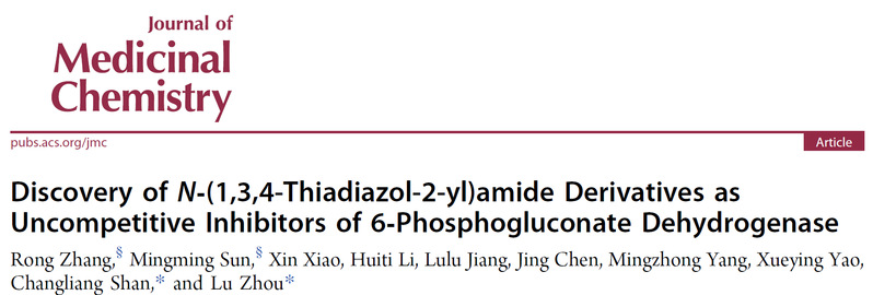 近日,竞技宝 周璐教授团队联合南开大学山长亮教授团队在杂志Journal of Medicinal Chemistry上发表题为“Discovery of N-(1,3,4-Thiadiazol-2-yl)amide Derivatives as Uncompetitive Inhibitors of 6-Phosphogluconate Dehydrogenase”的研究论文,针对肿瘤代谢靶点6-磷酸葡萄糖酸脱氢酶(6PGD)开发了一系列新型反竞争性抑制剂用于肿瘤治疗。