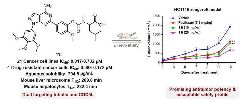 研究团队在前期工作总结的药效团模型基础上,经分区优化和表型筛选,获得了多个具有良好抗肿瘤活性的化合物,进而引入不同的氨基酸,最终发现了以化合物11i为代表的吡唑并[3,4-d]嘧啶类新型抗肿瘤化合物。11i对多种肿瘤及耐药肿瘤细胞均具有强效的抗增殖作用,而对正常细胞毒性明显降低。机制研究表明,11i显著阻滞细胞有丝分裂进程、诱导细胞凋亡和ROS生成、抑制血管形成。靶标研究发现,11i的微管蛋白聚集抑制活性有所降低(IC50 = 28.6 ± 1.5 μM)。通过Eurofins激酶谱分析,在5 μM浓度下化合物对一组参与细胞周期调控的激酶无明显抑制活性。基于生物素探针13a的靶点垂钓,进而结合沉默实验、共定位分析、下拉实验、热稳定性实验以及表面等离子共振分析等发现并验证了另一关键作用靶标——CDC5L。在结肠癌小鼠移植瘤模型中,化合物11i在10和20 mg/kg剂量下可显著抑制肿瘤生长,且对小鼠体重和脏器无明显影响、血液毒性也较低,具有潜在的开发和应用前景。此研究发现了首个Tubulin/CDC5L双靶点配体,为开发具有RNA剪接调控作用、特异性靶向CDC5L的抗肿瘤药物提供了可能。