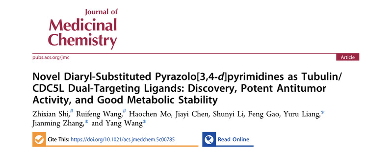 近日,王洋教授课题组在药物化学权威期刊Journal of Medicinal Chemistry发表了题为“Novel Diaryl-substituted Pyrazolo[3,4-d]pyrimidines as Tubulin/CDC5L Dual-targeting Ligands: Discovery, Potent Antitumor Activities and Good Metabolic Stability”的研究论文,报道了首个具有强效抗肿瘤活性和良好代谢稳定性的Tubulin/CDC5L双靶点配体,并阐明了其作用机制。