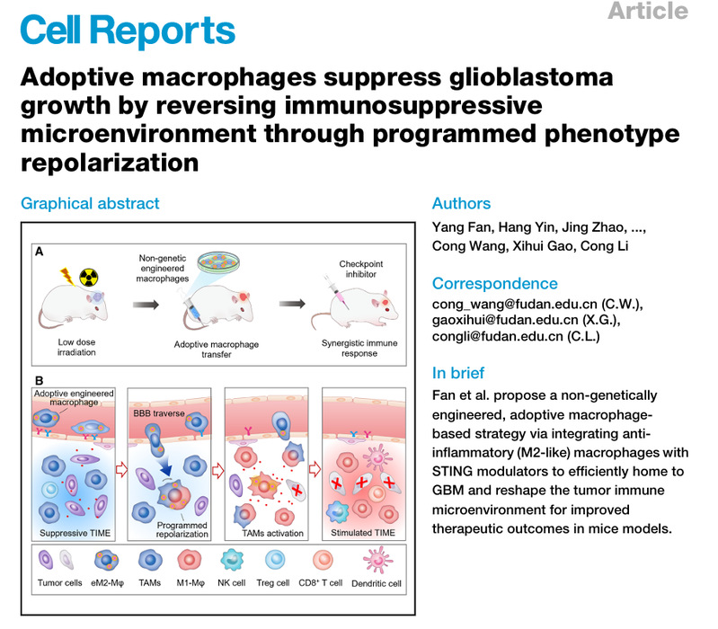 近日,竞技宝 李聪教授团队在Cell Reports杂志上发表了题为:“Adoptive Macrophages Suppress Glioblastoma Growth by Reversing Immunosuppressive Microenvironment through Programmed Phenotype Repolarization”(表型程序转换巨噬细胞逆转脑胶质瘤免疫抑制微环境)的研究型论文。该工作围绕GBM免疫治疗预后差的临床挑战,提出了程序性调节过继巨噬细胞表型技术,在促进细胞肿瘤入脑归巢情况下逆转胶质瘤免疫抑制微环境。该工作发现巨噬细胞表型与其GBM归巢效率具有相关性,抑炎表型巨噬细胞较促炎表型可更有效地穿越血脑屏障并进入脑肿瘤。据此,课题组构建了活性氧响应性释放干扰素基因刺激物(STING)激动剂的聚合物,其与抑炎表型巨噬细胞共孵育得到工程化M2样巨噬细胞(eM2-Mφs)。静脉注射后,该工程化细胞在初期维持抑炎表型,实现血脑肿瘤屏障高效跨域和肿瘤浸润。随着细胞内STING激动剂逐步释放和积累,工程化巨噬细胞逐渐转变为促炎表型并释放细胞因子逆转肿瘤免疫抑制微环境。实验结果显示单独注射工程化巨噬细胞,或将其与低剂量放疗或免疫检查点抑制剂联合使用,均能够显著抑制GBM模型生长并延长小鼠存活期。该工作充分利用巨噬细胞的高组织迁移性和表型可塑性实现肿瘤免疫抑制微环境活化,为提高脑胶质瘤免疫治疗响应提供了新思路。