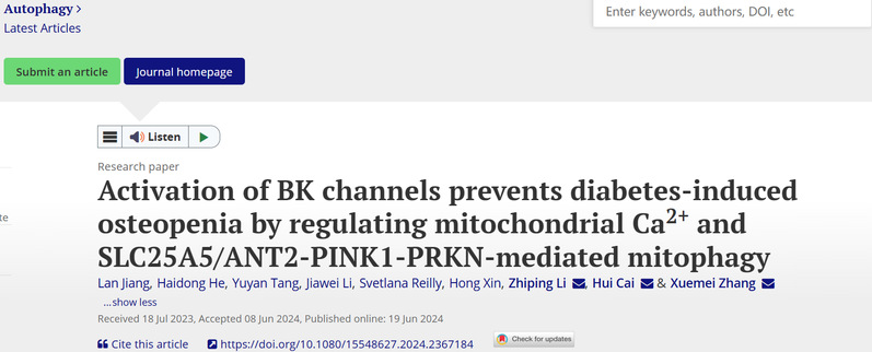 2024年6月19日,竞技宝 药理学系张雪梅教授团队在《Autophagy》杂志发表题为“Activation of BK channels prevents diabetes-induced osteopenia by regulating mitochondrial Ca2+ and SLC25A5/ANT2-PINK1-PRKN-mediated mitophagy”的研究论文。