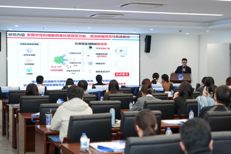 复旦大学附属中山医院2021级直博生吴英成围绕“解码肿瘤抗原提呈:从免疫识别到AI新药设计”展开报告。他分享了在多组学分析、人工智能辅助药物设计等方面的研究成果与科研心得,展现交叉学科在解决生物医学难题中的潜力,为在场同学树立了学术标杆。