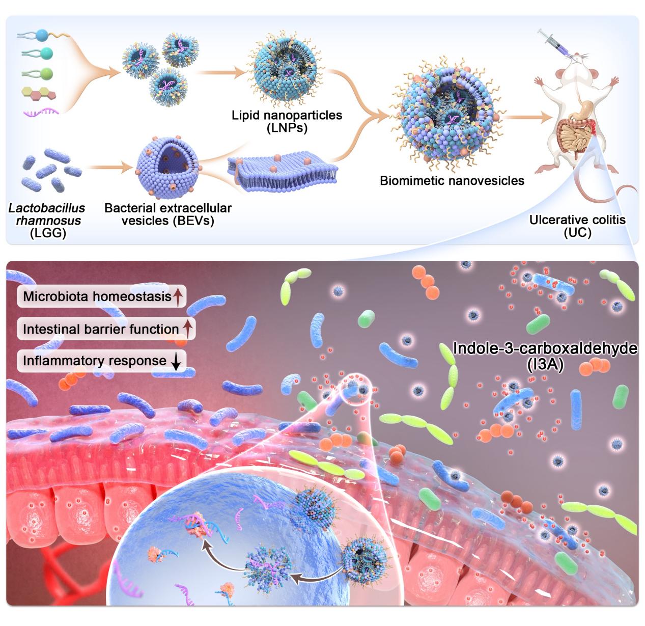 近日,竞技宝 戚建平课题组在Science Advances期刊发表最新研究成果“miRNA-loaded biomimetic nanoparticles orchestrate gut microbe to ameliorate inflammatory bowel disease”,报道了一种能够对共生菌鼠李糖乳杆菌进行改造的仿生纳米颗粒。通过将鼠李糖乳杆菌来源的细菌胞外囊泡(Bacterial extracellular vesicles, BEV)与脂质纳米粒(Lipid nanoparticles, LNP)进行功能化结合,制备了细菌胞外囊泡-脂质纳米粒(BEV-LNPs)。该纳米载体对鼠李糖乳杆菌的靶向效率显著高于大肠杆菌。体内外稳定性实验表明,相较于传统脂质纳米粒,BEV-LNPs在模拟生理介质及胃肠道环境中展现出更佳的稳定性。将该纳米载体与5-ASA联合使用时,促进了鼠李糖乳杆菌的增殖并增加了吲哚-3-甲醛的生成量,在急性和慢性结肠炎模型中均显著改善了治疗效果,有效减轻肠道炎症,修复受损肠道上皮屏障,并促进肠道菌群重新恢复平衡。