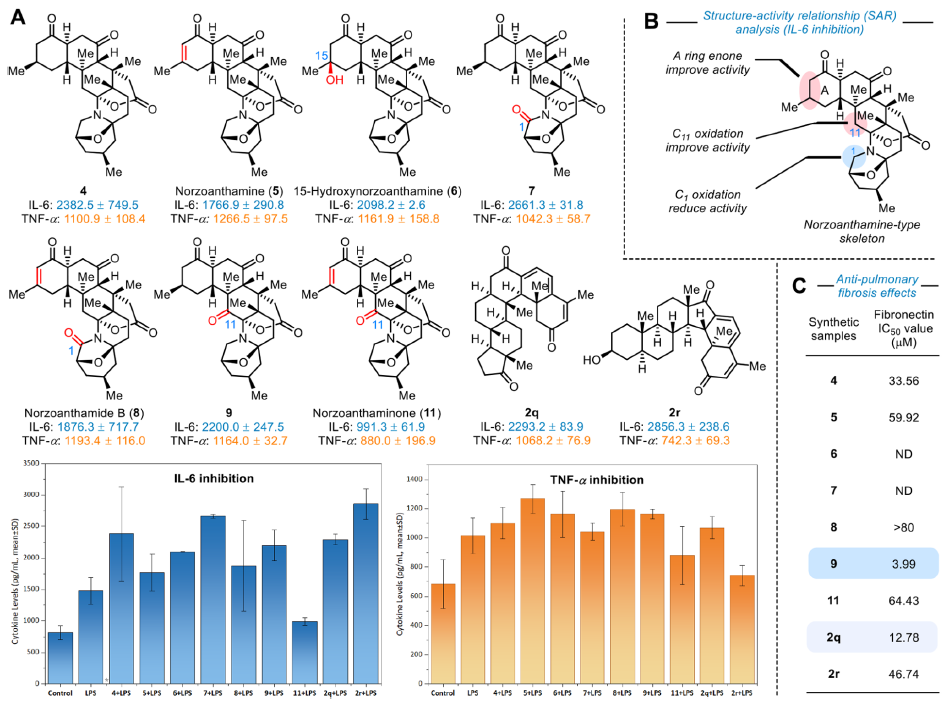 利用去对称化、去芳构化6π电环化反应,项目团队获得了一系列具有复杂结构与潜在生物活性的多环化合物及天然产物类似物。通过与交通大学仁济医院杨帆课题组合作,项目团队证实了该类化合物具有良好的抗炎活性与抗肺纤维化的活性(化合物9,IC₅₀ = 3.99 μM),并在IL-6的抑制方面对构效关系进行了探讨(图5)。该部分活性研究为该类复杂多环化合物的开发与应用奠定了基础,展现出了此类海洋生物碱良好的研究前景。