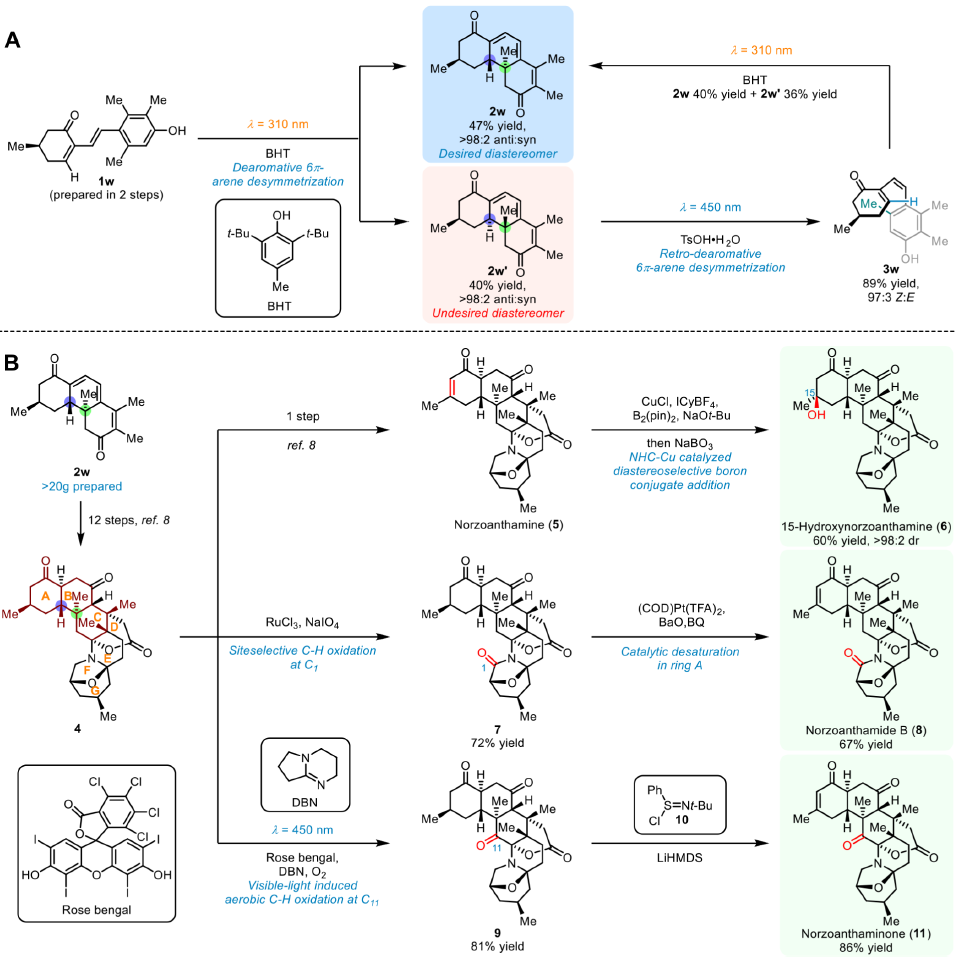项目团队将去对称化、去芳构化6π电环化反应及其逆向反应的研究成果应用于花群海葵碱类天然产物的全合成,完成了该家族多个复杂天然产物的首次全合成(图4)。利用去芳构化6π电环化反应,该类天然产物ABC母核2w的合成仅需要3步。值得一提的是,电环化反应产生的副产物2w’可通过逆反应转化为顺式多烯3w,进而再次应用于正向过程并部分转化为期望的产物2w,为逆向去芳构化6π去对称化反应的应用提供了良好的案例(图4A)。