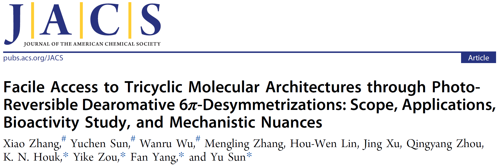 竞技宝 孙域课题组近期发展了光调控的可逆6π去芳构化反应,相关成果以Facile Access to Tricyclic Molecular Architectures through Photo-Reversible Dearomative 6π-Desymmetrizations: Scope, Applications, Bioactivity Study, and Mechanistic Nuances为题,在线发表于权威期刊Journal of the American Chemical Society。