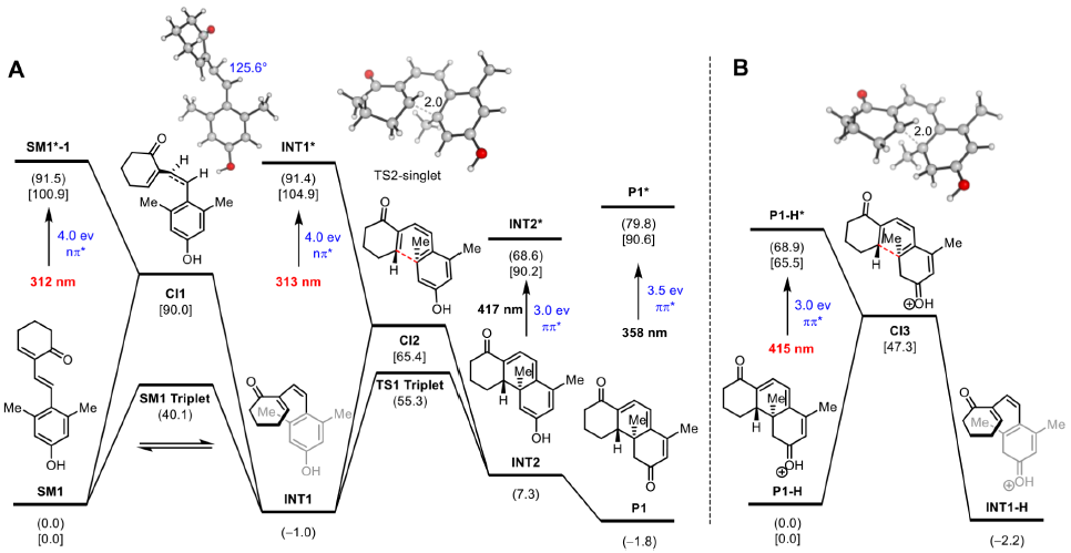 理论方面,该光可逆反应在不同波长下方向逆转的机理同样引人关注。交通大学竞技宝 邹一可及UCLA Houk团队采用DFT方法对此进行了探究,证实该光可逆反应的方向由入射光波长与质子化状态协同调控(图6):高能紫外光(310 nm) 驱动正向反应,依次经 光致 E→Z异构化 与 光促 6π-电环化 生成热力学稳定产物 P1;低能可见光(450 nm) 在 酸辅助下 通过质子化物种 P1−H的吸收,驱动逆向 6π-电环开环,实现反应逆转。