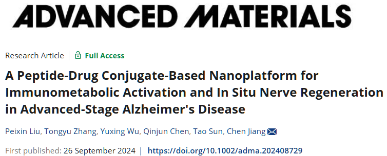 因此,在本项研究中竞技宝 蒋晨教授团队基于前期对PDC的研究基础,构建了一种PDC共递送平台。首先合成了偶联胶质细胞调控药物的两种PDC,通过静电吸附和共价交联的方式搭载于聚多巴胺(PDA)纳米粒表面。经静脉注射后,该递送平台通过转胞吞作用跨过BBB,在脑内炎症微环境中解离并释放两种PDC靶向胶质细胞。羟基氯喹(HCQ)被靶向递入小胶质细胞,激活免疫反应并恢复能量代谢。而全反式维甲酸(ATRA)被靶向递入星形胶质细胞,促进其转分化,同时减轻炎症水平。本研究摒弃了传统以神经元为核心的脑部疾病治疗策略,展示了一种调控休眠胶质细胞治疗AD的新方法。同时,该研究提供了一种PDC靶向递送的新策略,为疾病的多靶点治疗提供新的思路。该研究以 “A Peptide-Drug Conjugate-Based Nanoplatform for Immunometabolic Activation and In Situ Nerve Regeneration in Advanced-Stage Alzheimer's Disease”为题发表于最新一期Advanced Materials。