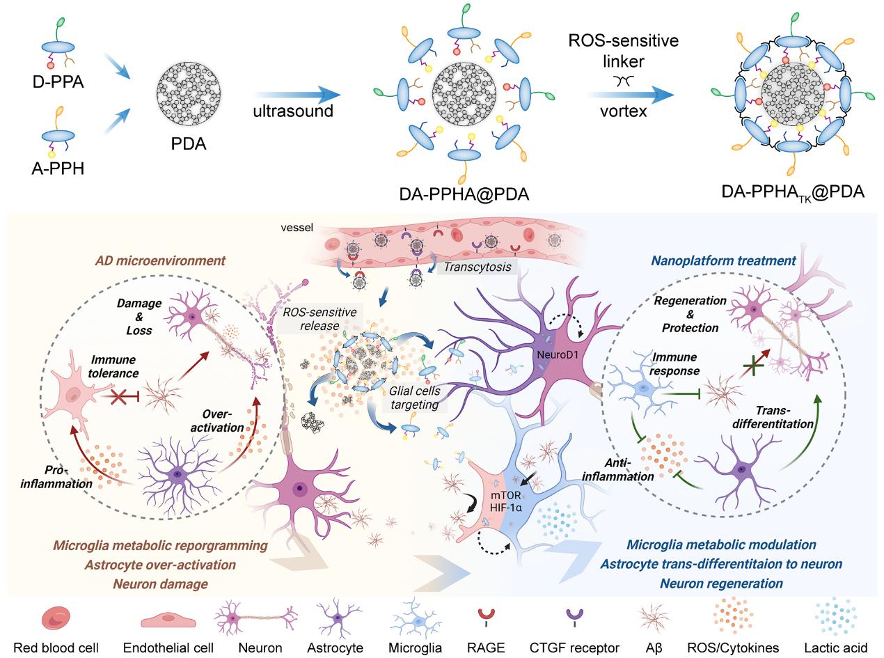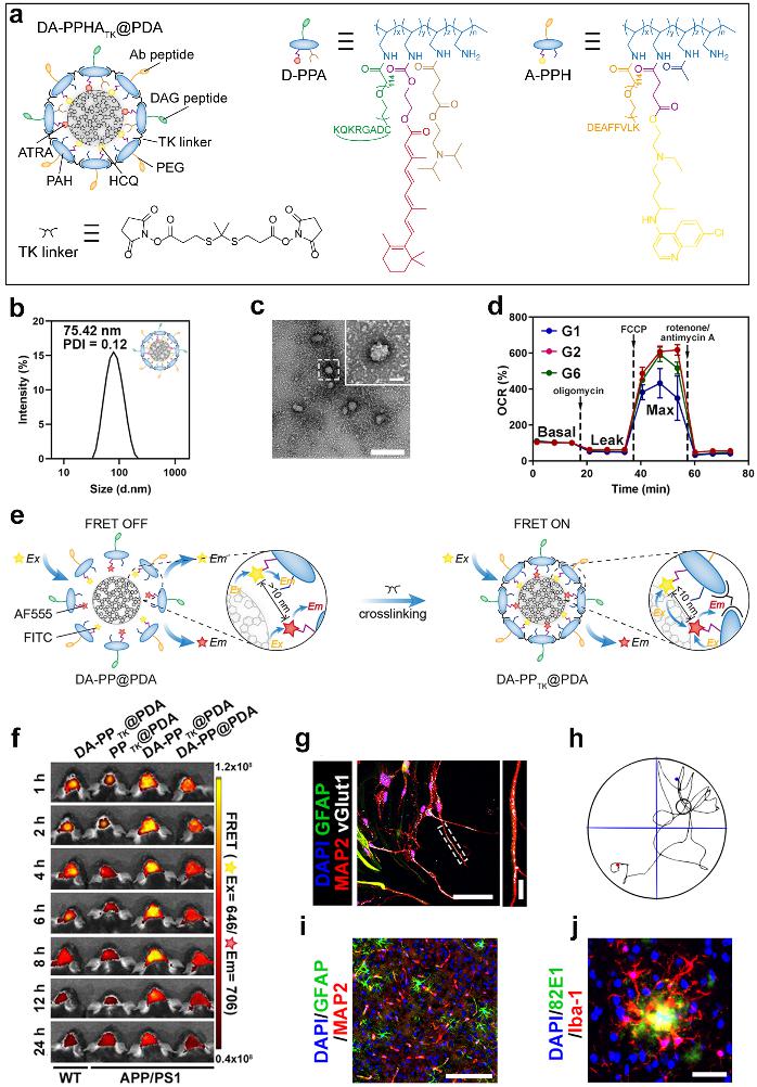 该递送系统呈现球形结构,粒径约为75 nm左右。经体内外实验验证,DA-PPHATK@PDA能够选择性靶向胶质细胞,激活小胶质细胞代谢-免疫网络,促进毒性蛋白降解;推动星形胶质细胞干性激活,原位产生成熟功能性神经元。此外,在递送系统制备过程中意外发现交联剂的加入能够诱导FRET效应产生,从而实现AD转基因小鼠脑内炎症诊断。