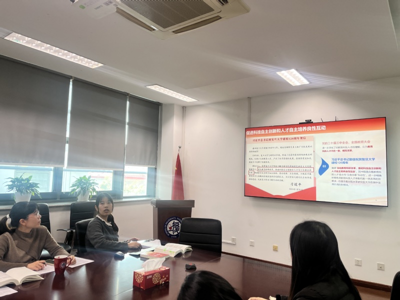 活动伊始,轮值主讲教师张君围绕党的二十届四中全会精神和《习近平谈治国理政》第五卷的相关内容,结合习近平总书记考察上海重要讲话精神、致复旦大学建校120周年贺信精神和总书记及对博医团勉励语精神,系统梳理了其中一体推进教育发展、科技创新、人才培养的内容,重点阐述了“科技自主创新与人才自主培养良性互动”的内在逻辑。高校作为教育、科技、人才的交汇点,必须发挥好核心枢纽作用,深入推动“两个自主”良性互动。大家表示,作为高校教育者,必须要将《习近平谈治国理政》第五卷内容、党的二十届四中全会精神学习成果转化为实际行动,更新教育理念和内容,深化教育、科技、人才体制机制的一体化改革,打破壁垒,畅通循环,让创新要素与人才资源高效涌动,让我们的工作有效服务于培养拔尖创新人才的任务中。