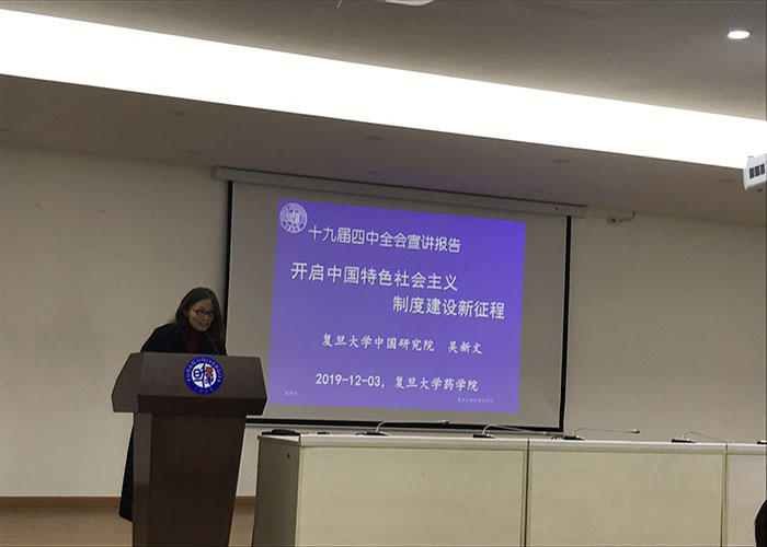为进一步学习宣传贯彻党的十九届四中全会精神,2019年12月3日下午,竞技宝 党委举办十九届四中全会精神专题讲座,邀请复旦大学中国研究院吴新文教授为竞技宝 教职工进行十九届四中全会宣讲。讲座在张江校区330报告厅进行,由竞技宝 党委副书记史雪茹主持,竞技宝 全体教职工参加。