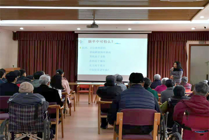 当日上午,阳光明媚,虽是初冬时节,金杨养老院却满眼绿色,花园里的常青植物焕发着勃勃生机。党员们来到金杨养老院,为老人们送上了美丽的鲜花和诚挚的问候,并由教工四支部成员秦晶副教授带来了一场科普讲座——“脑卒中的防治策略”。冬天是脑卒中的高发季节,秦老师结合脑卒中相关的最新临床进展,深入浅出地为老人们讲解了脑卒中这种冬季高发脑血管疾病的起因、自查、预防和相关的心理调适。报告厅座无虚席,不但有白发苍苍的在院老人,就连家属们也慕名而来,认真聆听,反响热烈。