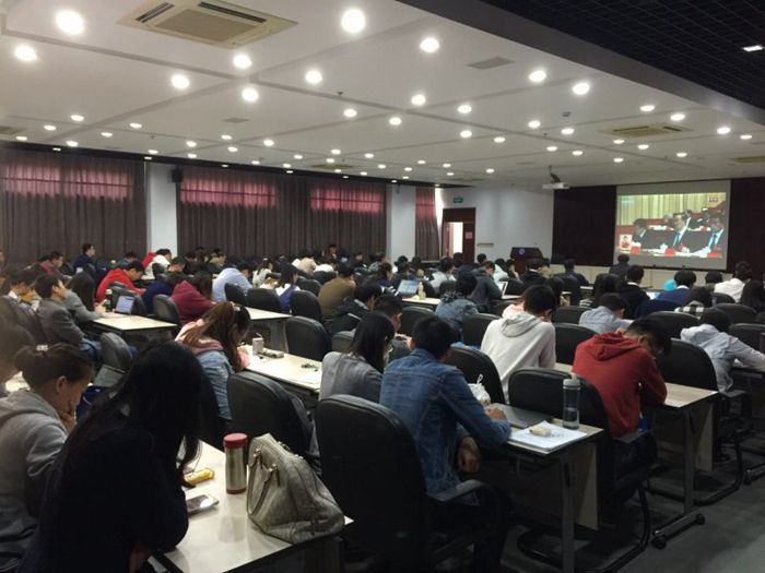 2017年10月18日上午,举世瞩目的中国共产党第十九次全国代表大会在北京人民大会堂隆重开幕。竞技宝 党委组织党政班子成员、支部书记、科室主任、学生党总支委员及学生党员骨干等在张江校区行政楼106报告厅集中收看“十九大”开幕盛况。全院15个党支部(包括教工、学生和退休党支部)通过电视、网络等媒体集体观看了现场直播。
