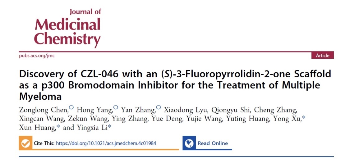 近日,该课题组与临港实验室黄洵研究员课题组、中国科竞技宝 广州生物医药与健康研究院许永研究员课题组合作在药物化学专业杂志Journal of Medicinal Chemistry上发表了题为“Discovery of CZL-046 with an (S)-3-Fluoropyrrolidin-2-one Scaffold as a p300 Bromodomain Inhibitor for the Treatment of Multiple Myeloma”的研究论文,报道了一种新型p300溴结构域抑制剂CZL-046并研究了抗多发性骨髓瘤的活性和作用机制。