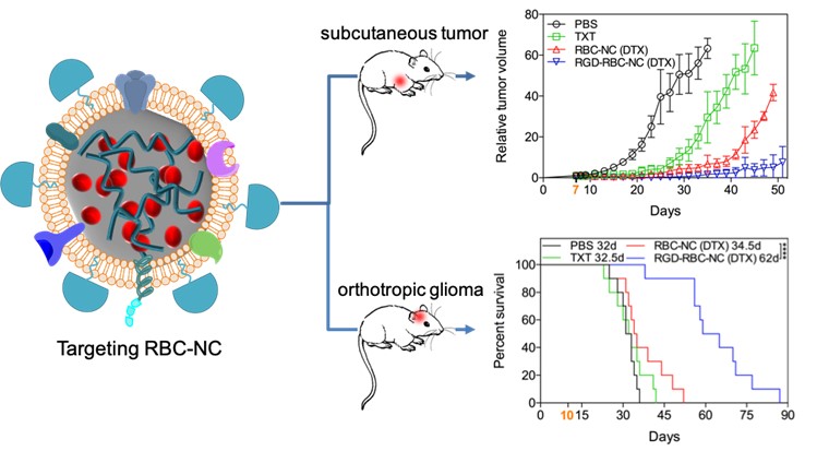 本研究成果是将红细胞膜包覆在药物纳米晶外形成“仿生保护层”,使所制备的仿生纳米药物同时拥有天然红细胞膜和药物纳米晶的优势,即载药量大、稳定性高、生物相容性好、血循环时间长;在红细胞膜表面修饰靶向分子c(RGDyK),使所制备的仿生纳米药物同时具有对肿瘤新生血管和肿瘤细胞靶向识别能力,携带药物跨越血-脑肿瘤屏障并递送至肿瘤细胞内,对脑胶质瘤实施高效精准打击,并在高剂量化疗情况下保证了治疗的安全性。该主动靶向仿生纳米药物的制备工艺简单且环保,易于产业化。同时该研究成果也为脑部肿瘤和外周实体瘤的临床治疗提供了一种新的选择,应用前景好。