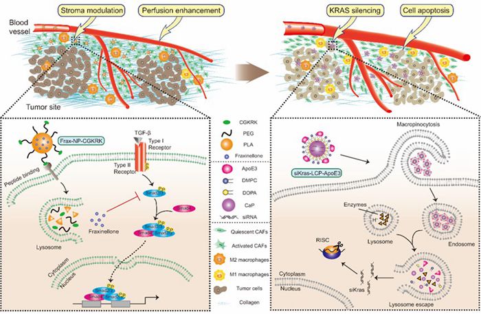 复旦大学陈钧教授和上海交大高小玲研究员团队合作报道了联用微环境调节和肿瘤细胞靶点干预以提高胰腺癌疗效的研究。首先筛选得到具有TGF-β调节作用的天然产物梣酮,并将其包载于靶向纳米制剂中,其能抑制CAFs的活化,减少胶原的分泌,促进肿瘤血管正常化,弱化屏障作用而有利于后续制剂在肿瘤部位的渗透。其次,构建具有沉默KRAS突变功能的包载SiRNA的仿生化高密度脂蛋白纳米系统,该体系能够通过胰腺癌细胞攫取外界营养物质所依赖的大胞饮机制,从而被肿瘤细胞大量摄取;磷酸钙纳米内核可使SiRNA从溶酶体中有效逃逸并释放至胞浆,发挥基因沉默的作用。在胰腺癌原位模型上,将两种制剂贯序给药可起到高效低毒的治疗效果,显著延长荷瘤裸鼠的生存期。该研究可为基质丰富且无药可靶的肿瘤治疗提供设计思路和理论依据,具有较高参考价值。