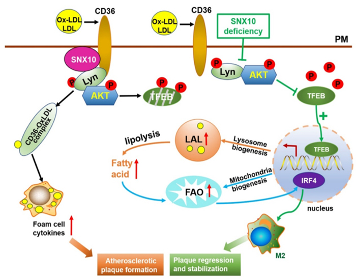 研究发现,分选连接蛋白10(SNX10)作为溶酶体/内体途径的重要调节蛋白,在人AS斑块中高表达,髓系特异性敲除SNX10可减少高脂饲料喂养的ApoE小鼠的斑块形成并增加斑块稳定性,而且斑块中浸润的巨噬细胞数目显著性下调,呈现抗炎表型为主。进一步研究发现,低密度脂蛋白(LDL)刺激主要通过SNX10招募并活化Lyn-AKT复合体,促进CD36的内化,增加LDL的摄取。而SNX10缺失限制了该复合物的形成,通过抑制CD36的内化减少泡沫细胞形成。同时,SNX10缺失引起的AKT活性下调诱导核转录因子TFEB转位入核。活化的TFEB进一步促进溶酶体生物合成,并增强溶酶体酸性脂肪酶(LAL)的活性,上调线粒体氧化磷酸化水平,通过IRF4途径诱导巨噬细胞向抗炎型表型极化,从而改善AS病理进程(图1)。