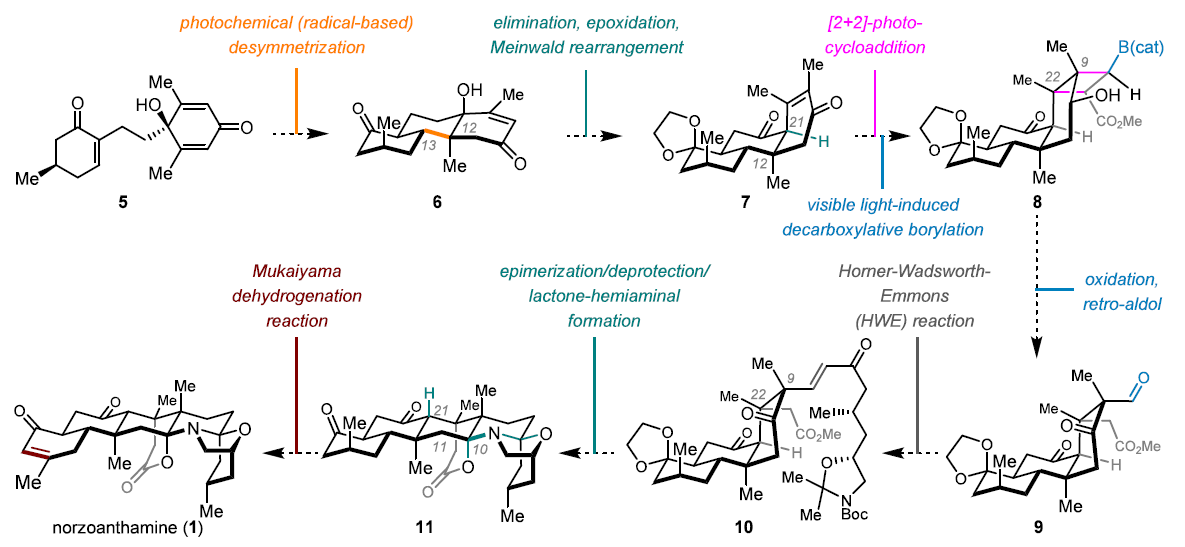 孙域课题组根据该天然产物结构特点,巧妙利用天然产物潜在的对称性因素,设计去对称化合成策略。同时,依据合成的需要,项目团队原创光促进6π电环化去芳构化反应,实现了天然产物母核的高效构建。在解决合成的另一难点——C9-C22位连续季碳中心的构建方面,团队成员打造“非天然”的顺式骨架,并利用多种光化学反应等实现骨架的连接、切断与扭转。最终,在新策略、新反应、新技术的加持下,孙域课题组实现了去甲花群海葵碱类海洋天然产物的高效、简洁合成,其合成步骤仅需16步,较现有路线36-47步显著缩短,且合成总效率最高(5.4% vs 0.0069-3.5%),合成规模最大(>0.2g),较现有工作具有明显优势。