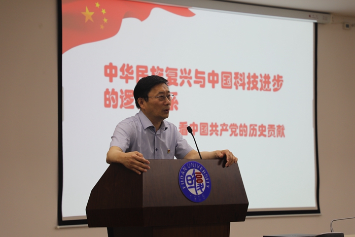 大会最后,由复旦大学党史学习教育宣讲团专家陆伟跃教授为在场师生带来一场主题为“中华民族复兴与中国科技进步的逻辑关系——看中国共产党的历史贡献”的党史宣讲。陆老师认为所谓复兴,顾名思义,是曾经兴盛、经历衰弱到再度昌盛。他将五千年中华民族文明史分成过去的辉煌、曾经的屈辱、现在的荣光三个部分:从3到13世纪,中国保持让西方望尘莫及的科技知识水平;到16至17世纪,中国科技发展势头开始减弱;再到中国共产党成立、中华民族站起来。他强调中华民族的文化源远流长,值得传承和发展,现在是我国发展的大好时期,不久的将来会实现中华民族的伟大复兴。陆老师认为民族独立、国家富强是科技发展的基础,中国科技进步又是实现中华民族伟大复兴的前提,中国共产党致力于国家科技水平的提质增效,为中华民族伟大复兴做出了卓有成效的历史贡献。我们作为科技工作者,应学习贯彻习近平总书记在两院院士大会中国科协十大上的重要讲话精神,坚持党对科技事业的全面领导,在基础研究和关键核心技术等领域不断寻求新突破,不断加强创新型人才培养,将学校打造成国家战略科技力量,为支撑高水平科技自立自强、科技强国建设作出贡献。