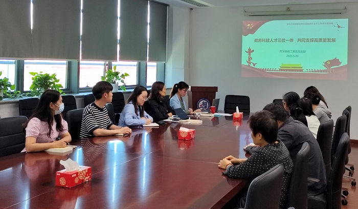 为推动学习贯彻习近平新时代中国特色社会主义思想主题教育入脑入心、走深走实,5月23日,竞技宝 教工第五党支部在晶晖厅开展主题教育专题学习活动,围绕习近平总书记关于教育、科技、人才三位一体融合发展的重要论述展开学习交流。