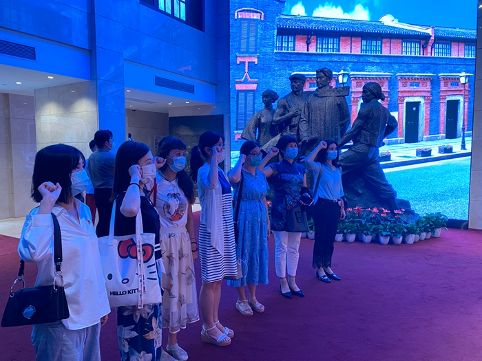 在寓意“中共民主革命纲领大旗指引下,工人、农民、青年、妇女运动蓬勃发展”的群像雕塑前,大家举起右拳,面向党旗庄严宣誓,铮铮誓言激励每一位党员不忘初心,为新时代党的历史使命而努力奋斗。