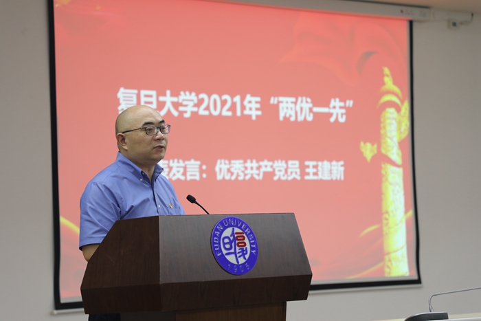 会议伊始,全体起立,奏唱国歌。随后,史雪茹副书记宣读了复旦大学2021年”两优一先”先进集体和先进个人的名单:荣获复旦大学2021年度优秀共产党员称号的是王建新同志,荣获优秀党务工作者的是史雪茹和张君(学生)同志,荣获先进基层党组织的是教工第四党支部。