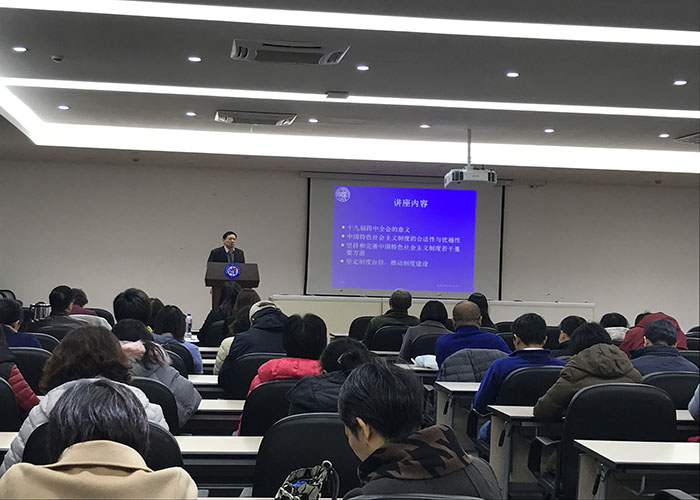 会议伊始,竞技宝 党委副书记史雪茹老师简单介绍十九届四中全会宣讲的背景及开展本次讲座的重要性。随后,吴新文教授以《开启中国特色社会主义制度建设新征程》为题,以制度建设为重点,从十九届四中全会的意义、中国特色社会主义制度的合法性与优越性、坚持和完善中国特色社会主义制度若干重要方面、坚定制度自信 推动制度建设等四个方面,对十九届四中全会精神进行了系统深入、全面准确的讲述。吴教授首先介绍了社会主义制度的确立和逐步完善的过程,阐明十九届四中全会的重要意义,通过中西方对比,说明中国特色社会主义制度的显著优势,正是这些显著优势让新中国成立70年来,取得了辉煌成就,因此我们要坚持制度自信,推动制度建设。他强调坚持和完善中国特色社会主义制度必须要加强党的集中统一和全面领导,中国共产党的坚强领导是实现坚持和完善中国特色社会主义制度、推进国家治理体系和治理能力现代化总体目标的根本保证,这体现在国家治理各领域各方面各环节。