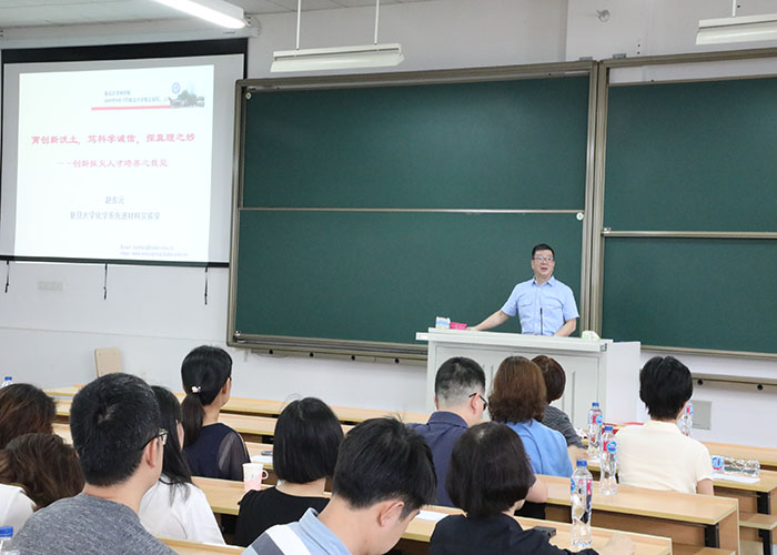 赵东元院士结合自身经历,从“择复旦渡无边学海、倾全力育科学之才、涵雅量建创新团队、怀初心筑介孔王国、笃诚信探科学表达”五个方面讲述了一名科研工作者的历程与心得;以介孔碳材料为例,分享了他对如何做科研以及如何进行学生创新能力培养的理解和体会;讲解了他对科学的理解以及一名科学家所肩负的专业责任、社会责任和人类责任;讲述了他对科研诚信的要求以及在科技论文写作发表中应遵守的学术道德规范。