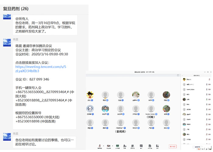 3月16日上午,在教职工们提前自学了习近平总书记关于坚决打赢疫情防控阻击战系列重要讲话精神后,药剂学系利用“腾讯会议”平台,进行了在线政治理论学习。全体教职员工认真地讨论了学习到的习近平总书记的讲话精髓,并就在新冠肺炎疫情防控的特殊环境中如何进行教学与科研工作,交流了经验与方法。各位教职员工均表示要在疫情下不忘工作,坚守自己的岗位,对学生负责,对学校负责,对科研负责,对自己负责。