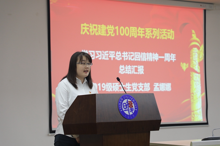 接着,2019级硕士生党支部孟娜娜作为学生代表汇报了一年来学习贯彻习近平总书记回信精神中的体会。她认为,在漫长的革命征程中,复旦历史上无数优秀的党员先辈们在办学、救国、强国的道路上上下求索,无私贡献,为当代复旦学子立下了好榜样。作为竞技宝 青年党员,去年新冠疫情的爆发让她深刻感受到药学人身上的医学责任,愿为新冠肺炎的临床药物治疗和防控工作做出贡献。前路漫漫,青年学生大有可为,她决心做中国医药卫生事业的一颗螺丝钉,坚定理想信念,践行初心使命。