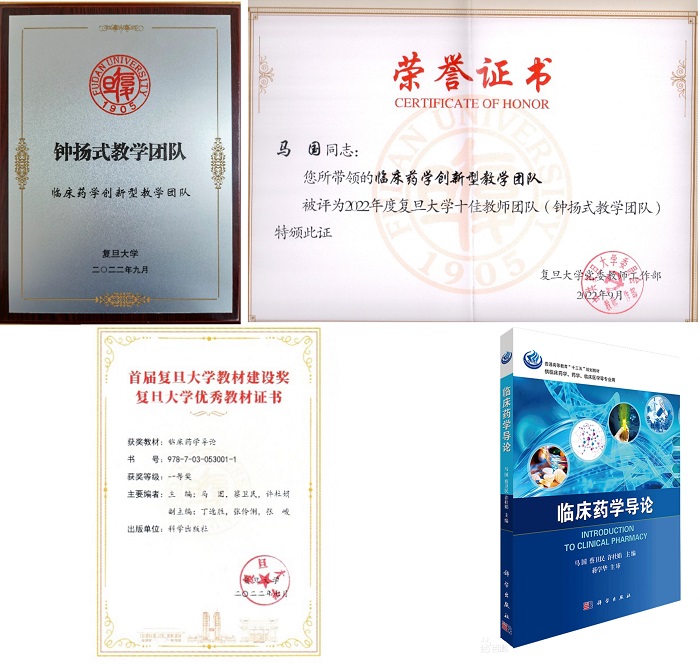 马国老师目前主讲课程7门,其中4门被评为上海市、复旦大学重点课程、示范课程或标杆课程;主持教改项目计10余项;编写“十三五”“十四五”规划教材专著20余部,其中主编7部,主编的《临床药学导论》荣获复旦大学优秀教材一等奖;荣获“钟扬式”教学团队带头人、“一健康基金”优秀教师奖、上海市教学成果奖一等奖,中华医学会医学教育研究立项课题一等奖等各类教学奖励20余项。指导的学生荣获国家奖学金,“全国大学生药苑论坛”创新成果奖一等奖、优秀奖等10余项;担任克卿书院本科生学术导师,已指导本科生获得“望道项目”等大学生科创项目和社会实践项目计20多项。