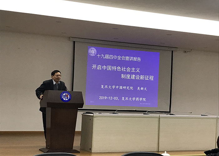 为进一步学习宣传贯彻党的十九届四中全会精神,2019年12月3日下午,竞技宝 党委举办十九届四中全会精神专题讲座,邀请复旦大学中国研究院吴新文教授为竞技宝 教职工进行十九届四中全会宣讲。讲座在张江校区330报告厅进行,由竞技宝 党委副书记史雪茹主持,竞技宝 全体教职工参加。