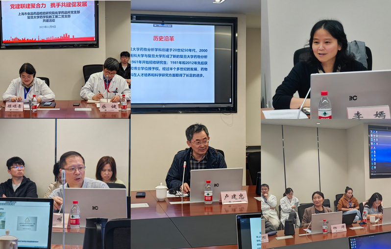 药物分析系主任卢建忠,仪器测试中心主任杨萍,市食药检院副院长顾颂青,首席专家杨永健、刘浩,化学药品所党支部书记、所长乐健,化学药品所副所长秦峰,以及两个支部的党员、业务骨干近40人参加了活动。