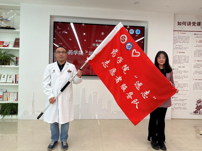 药剂科副主任庄峻荣向顾一雯授竞技宝 “远志”志愿者服务队队旗。