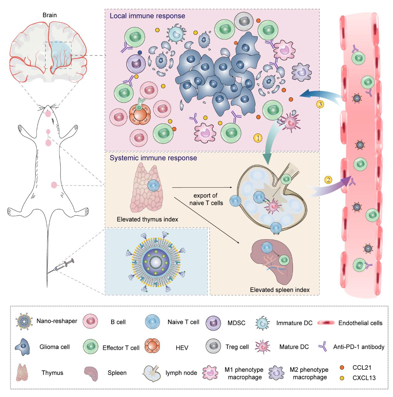 胶质母细胞瘤(GBM)是成人最常见和最致命的原发性恶性脑肿瘤。由于GBM的高度侵袭性和异质性,患者在标准化治疗手段下受益有限。免疫疗法是近年来新兴的肿瘤治疗手段,目前多数疗法通过诱导或激活效应T细胞来发挥抗肿瘤作用。然而GBM对免疫治疗响应率较低,主要原因为其引发严重的系统性和局部性免疫抑制,导致瘤内效应T细胞浸润不足。针对上述瓶颈问题,竞技宝 陈钧教授团队开发了一种名为纳米重塑者(Nano-reshaper)的纳米制剂,其可重塑系统性和局部性免疫功能,增加肿瘤床内效应T细胞的浸润程度,从而提高GBM对免疫检查点抑制剂的响应。该研究成果发表于国际权威综合性期刊《Nature Communications》。