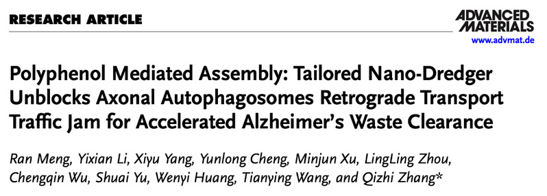 该研究以“Polyphenol Mediated Assembly: Tailored Nano-dredger Unblocks Axonal Autophagosomes Retrograde Transport Traffic Jam for Accelerated Alzheimer's Waste Clearance”为题在线发表于权威期刊Advanced Materials。
