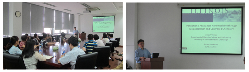 药剂教研室邀请来自美国伊利诺伊大学香槟分校的程建军教授来复旦大学张江校区进行访问交流。访问期间,程教授为广大师生带来了精彩学术报告,报告题目为“Translational Anticancer Nanomedicinesthrough Controlled Chemistry”。广大师生通过学习交流,进一步了解了肿瘤发展发生的机制,拓展了肿瘤靶向的研究思路,丰富了肿瘤靶向的研究内容。同时,程教授与蒋晨课题组就合作研究及联合培养研究生项目,展开了深入讨论。此次学术交流对加强国内外药剂学界的合作与沟通具有积极意义。