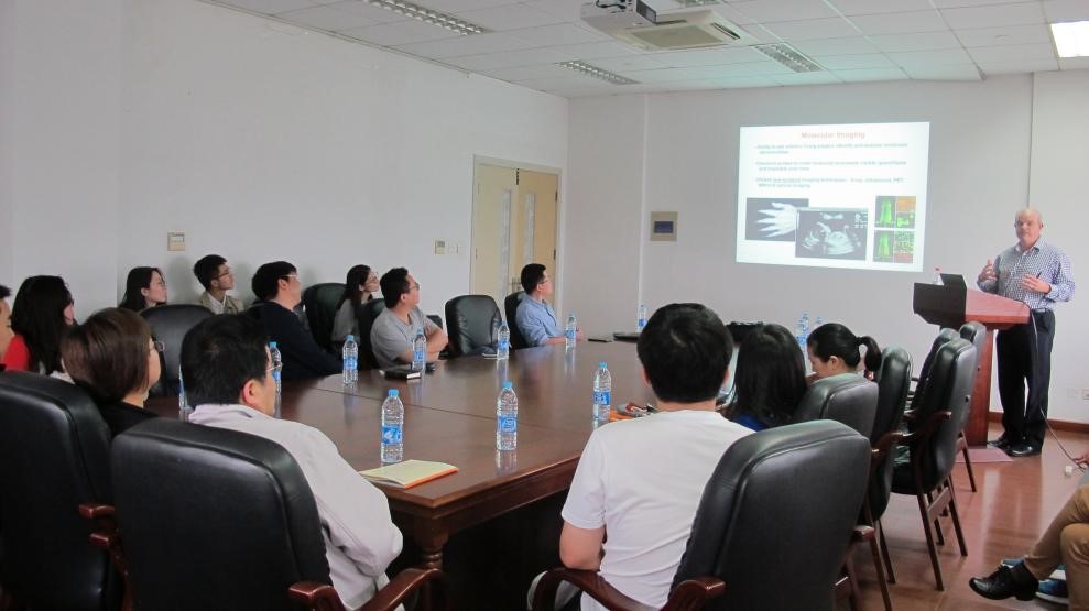 2)2016年5月9-13日,英国帝国理工大学Nicholas J. Long教授作为智能化递药教育部重点实验室高级访问学者,在复旦大学张江校区进行了为期五天的学术访问。Nick 教授多年来一直从事先进医学应用材料,无机化学和应用有机金属化学,特别是基于过渡金属和镧系稀土元素化合物的合成研究。迄今,其已在国际知名期刊发表论文150余篇,被引用5124次,H因子高达36。此次,Nick教授为竞技宝 师生带来了题为“Inorganic Chemistry for Biomedical Imaging”的精彩学术报告,详细介绍了无机化学在医学成像中应用的研究概况及最新进展。报告结束后,Nick教授与放射及相关学科科研人员就影像探针及生物标志物在药物研发设计中的应用进行了热烈讨论。
