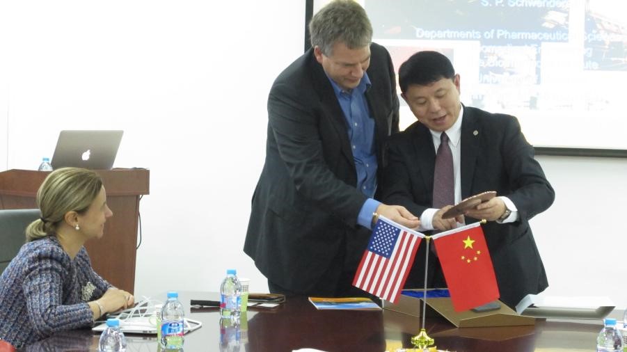 4)2016年11月22日下午,复旦大学药剂教研室邀请美国密歇根大学制药科学系主任Steven P. Schwendeman 教授夫妇访问竞技宝 。在竞技宝 科研楼晶晖厅王明伟院长首先向Schwendeman教授夫妇的来访表示欢迎,并介绍了竞技宝 的情况。随后,竞技宝 副院长、重点实验室副主任王建新教授主持了Schwendeman教授题为“Mechanistic evaluation of in vitro and in vivo release from PLGA microspheres employing a cage model”的学术报告,他着重介绍了PLGA纳米微球的体内外评价和其课题组的研究情况。听众们饶有兴趣地听取了报告,并与Schwendeman教授进行了交流。大家认为,Schwendeman教授带来了很多新的理念和想法,对今后的科研工作具有帮助。随后,Schwendeman教授夫妇在重点实验室主任陆伟跃教授和副主任王建新教授的陪同下参观了科研楼九楼的中试实验室和一楼仪器测试中心。