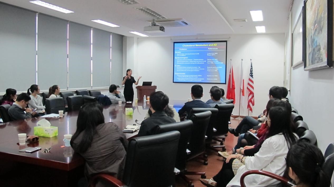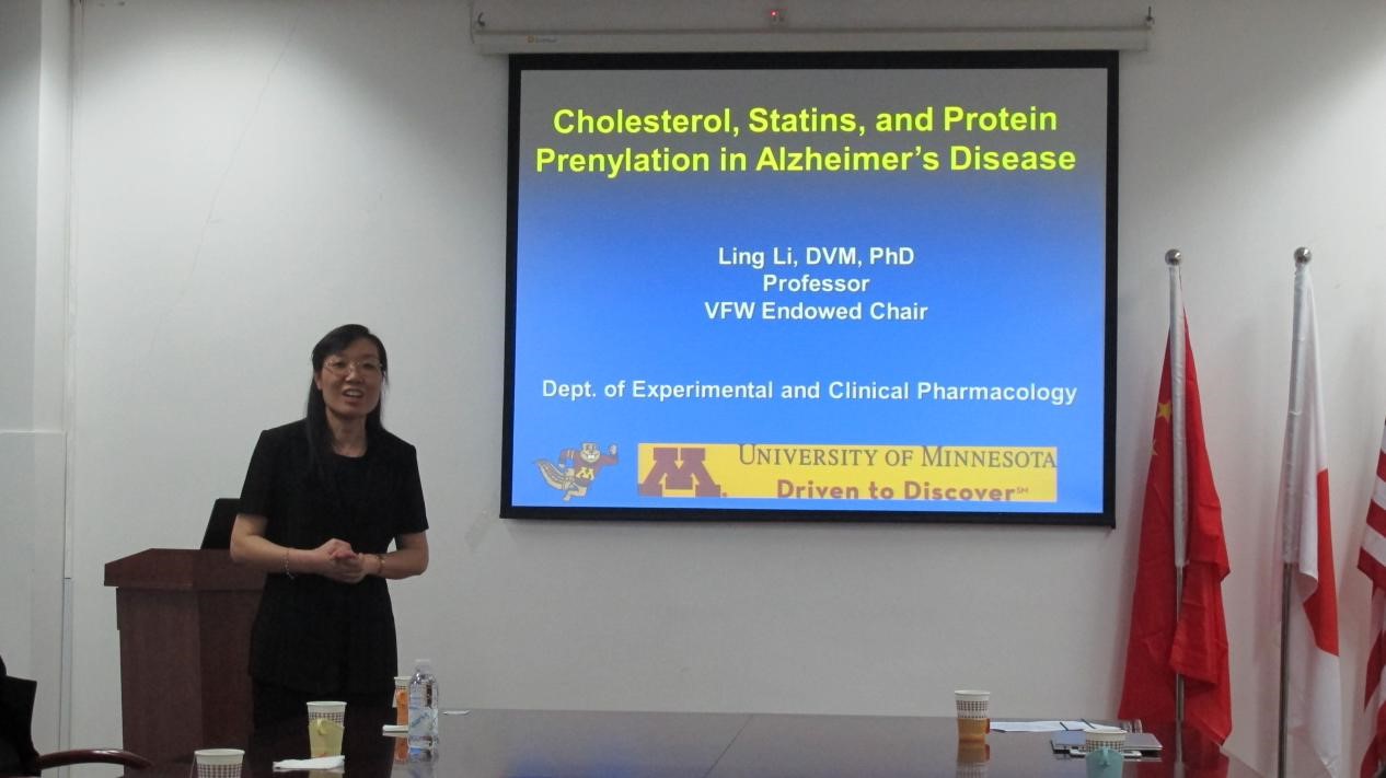 1)2016年4月20日,竞技宝 药剂教研室邀请美国明尼苏达大学实验与临床药理学李玲教授来访,并为竞技宝 广大师生带来了题为“Cholesterol, Statins, and Protein Prenylation in Alzheimer’s Disease”的精彩学术报告。李教授主要从事血脂代谢异常与阿尔茨海默病(AD)发病机制研究。先后承担NIH/NIA、阿尔茨海默病药物发现基金会等研究项目。李教授的讲座内容与药剂学密切相关,受到热烈欢迎。